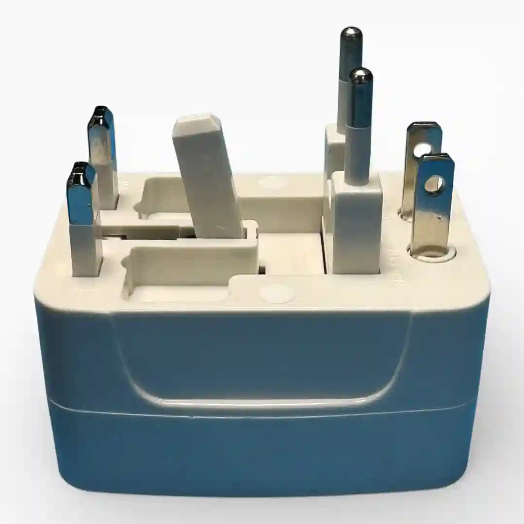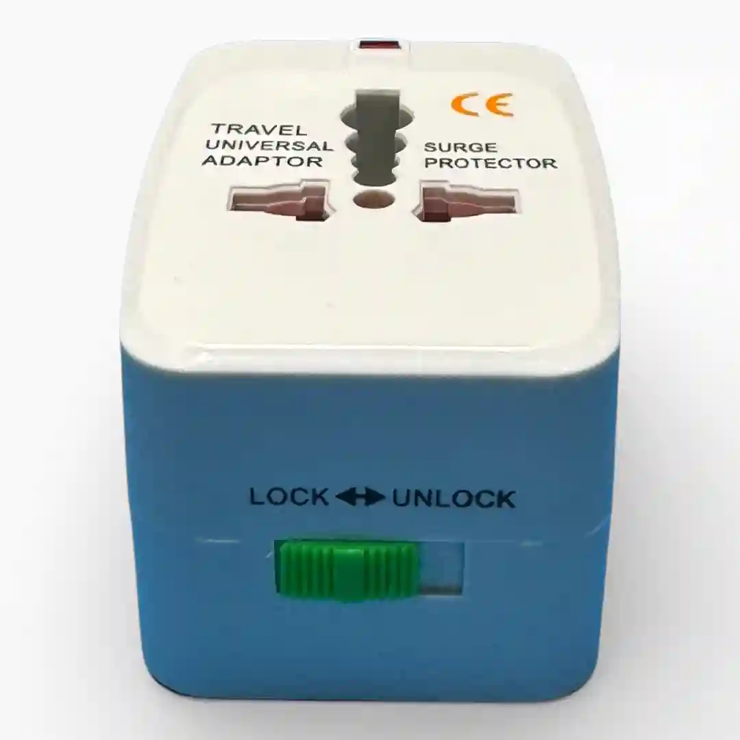 Características Adaptador universal de viaje Todo en uno Protector de sobretensión Sistema de bloqueo y desbloqueo manual Obturador de seguridad para protección infantil Luz indicadora de encendido Incluye bolsa de transporte textil color azul Color del producto: Blanco y azul Material: Para uso exclusivo de conductor en cobre