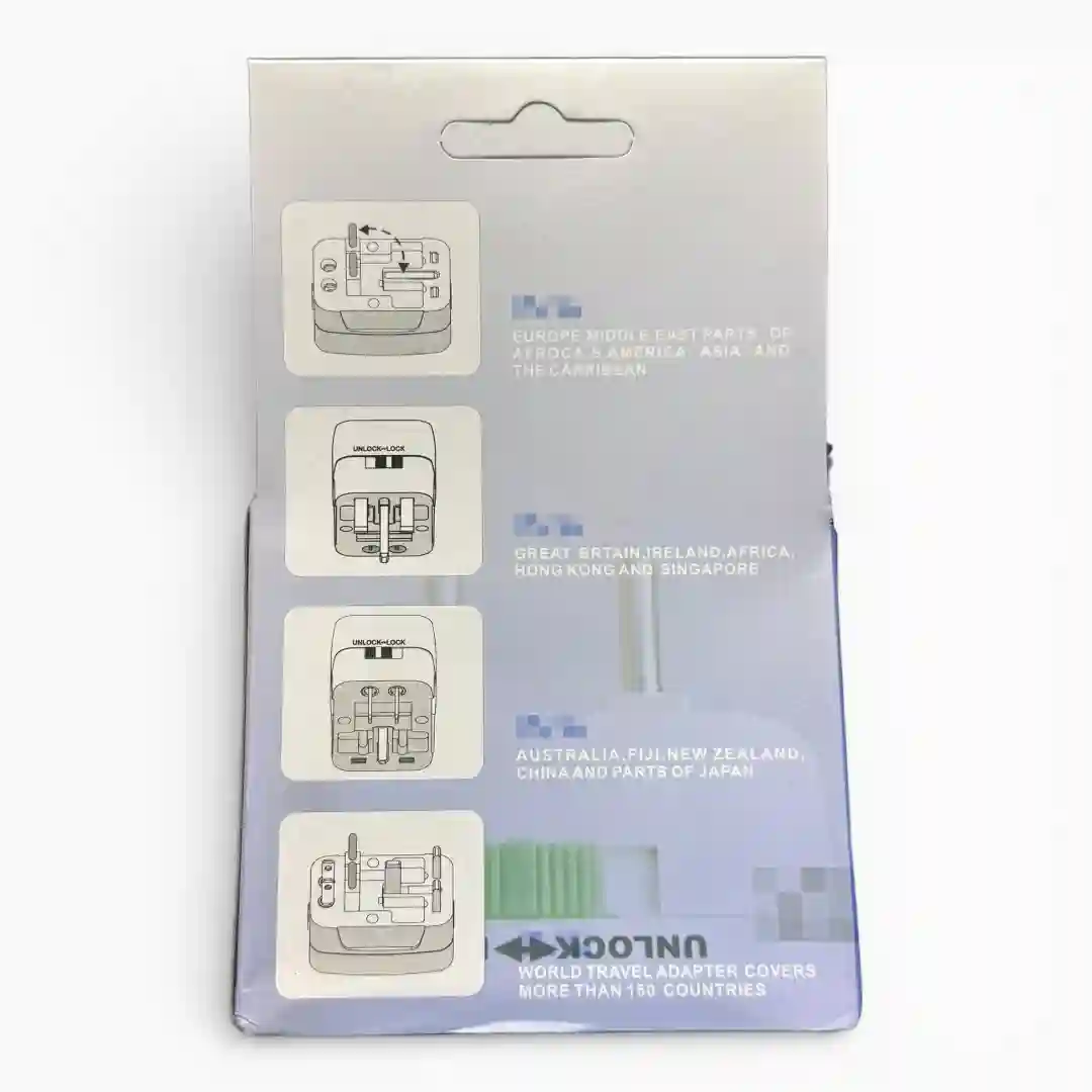 Adaptador de viaje internacional todo en uno diseñado para ofrecer compatibilidad global en más de 150 países. Este dispositivo versátil integra múltiples configuraciones de clavijas en un solo cuerpo compacto, permitiendo la conexión de equipos en diversas regiones geográficas de manera segura gracias a su protector de sobretensión incorporado. Su sistema de gestión de clavijas mediante interruptor deslizante garantiza un uso sencillo y un almacenamiento seguro.