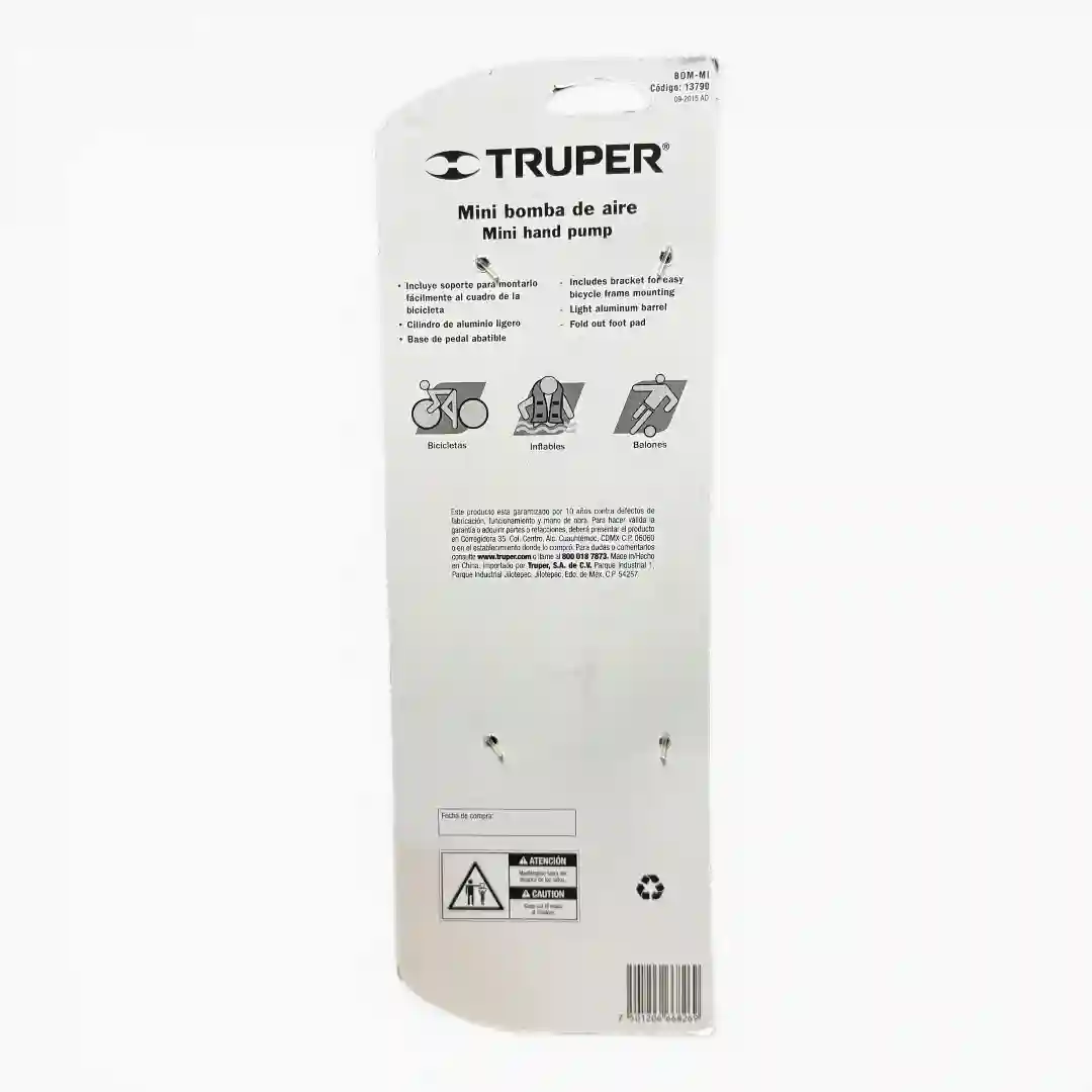 Código: 13790 Clave: BOM-MI Marca: Truper Contenido: 1 Bomba Color: Naranja y negro Presión máxima: 60 PSI (Libras por pulgada cuadrada)