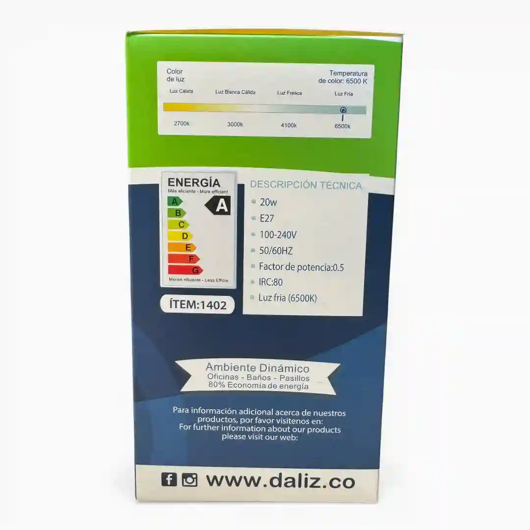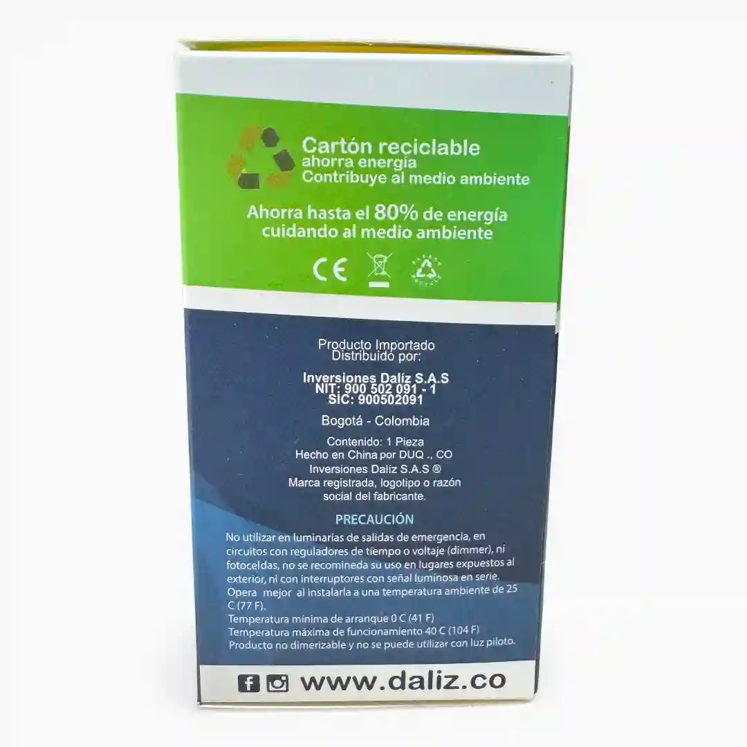 Bombillo LED de alta eficiencia con diseño cilíndrico, desarrollado para optimizar el ahorro de energía en diversos entornos. Este modelo proporciona una iluminación potente y clara, siendo una solución ideal para oficinas, baños y pasillos. Su tecnología permite un ahorro de hasta el 80% de energía, contribuyendo a la sostenibilidad mediante un empaque de cartón reciclable y un rendimiento duradero bajo estándares de calidad certificados.