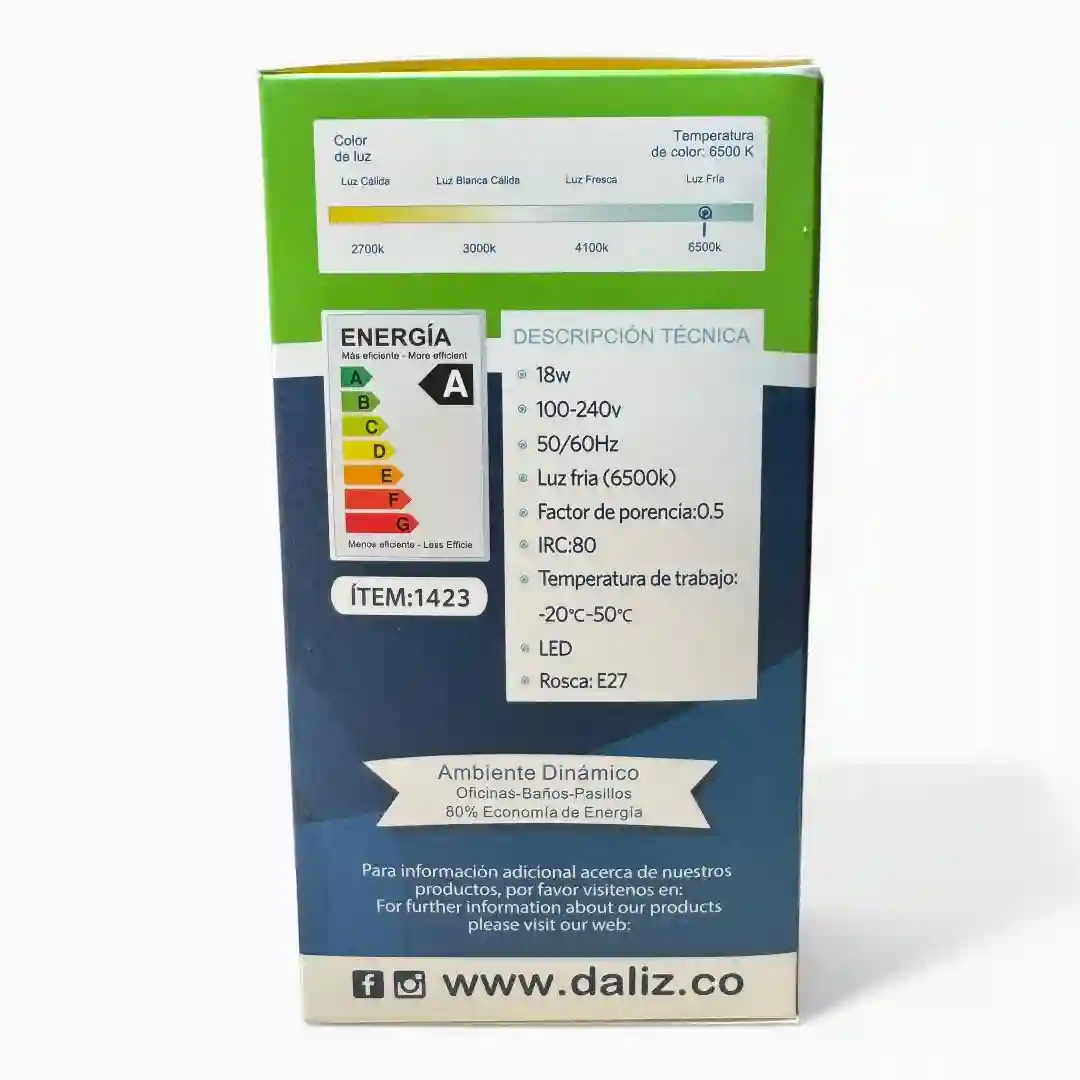 Bombillo de alta eficiencia energética con tecnología LED, diseñado para ofrecer una iluminación óptima en ambientes dinámicos como oficinas, baños y pasillos. Este modelo destaca por su capacidad de ahorro de energía de hasta un 80%, contribuyendo al cuidado del medio ambiente mediante el uso de materiales como cartón reciclable en su empaque. Proporciona una luz fría y constante, ideal para espacios que requieren claridad y precisión visual.