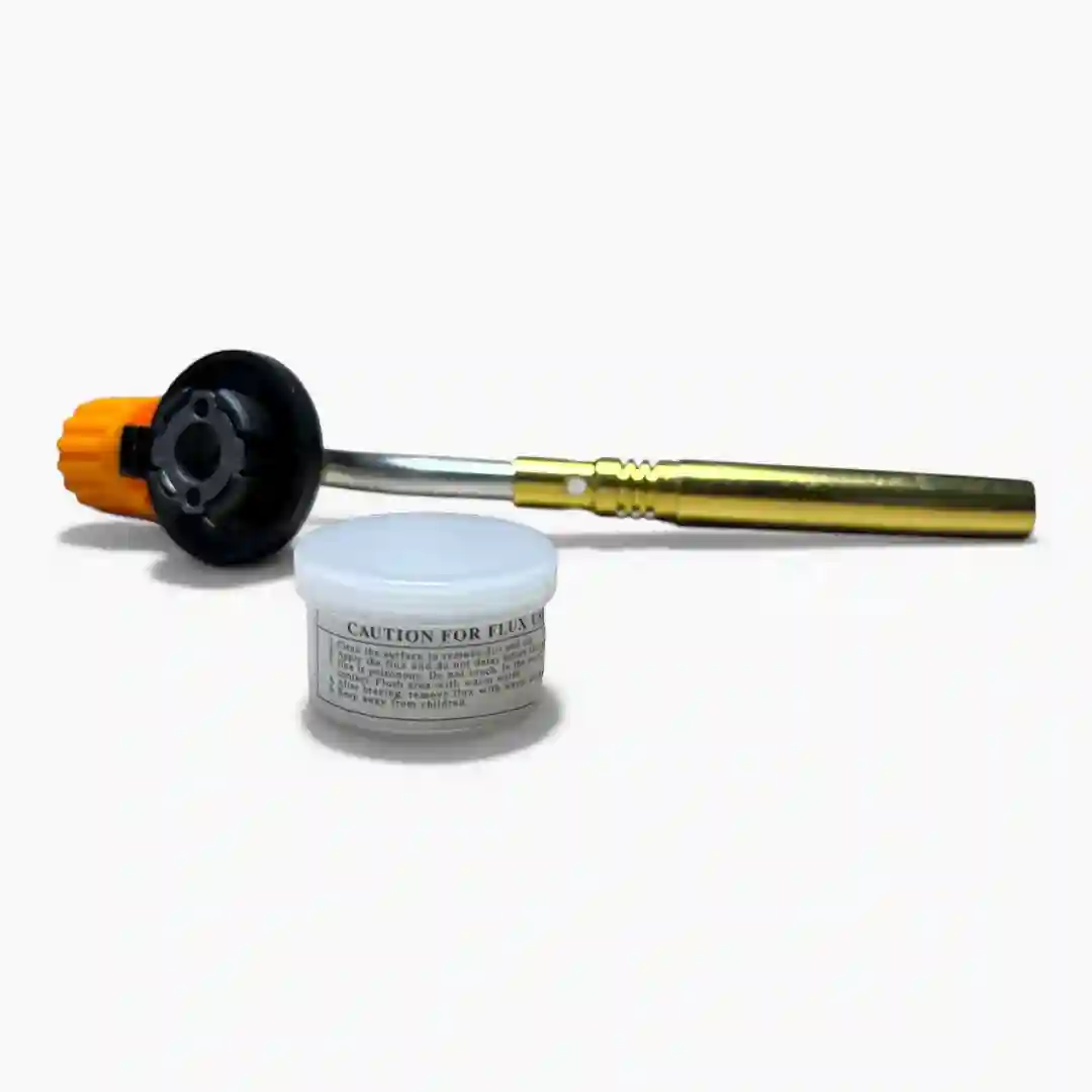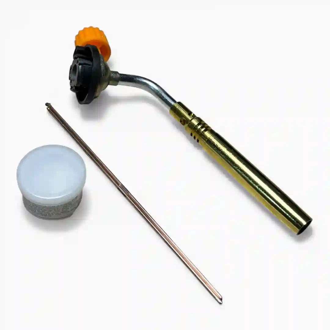 Componentes del set: Boquilla de soplete, varilla de soldadura y recipiente de fundente (flux)