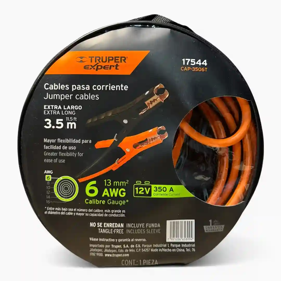 Cables pasa corriente de la línea Truper Expert, diseñados para ofrecer un rendimiento superior incluso en condiciones extremas. Su fabricación con mayor flexibilidad facilita el uso y manejo durante el auxilio vial. Cuentan con un diseño que evita enredos e incluyen una funda para un almacenamiento organizado y compacto.