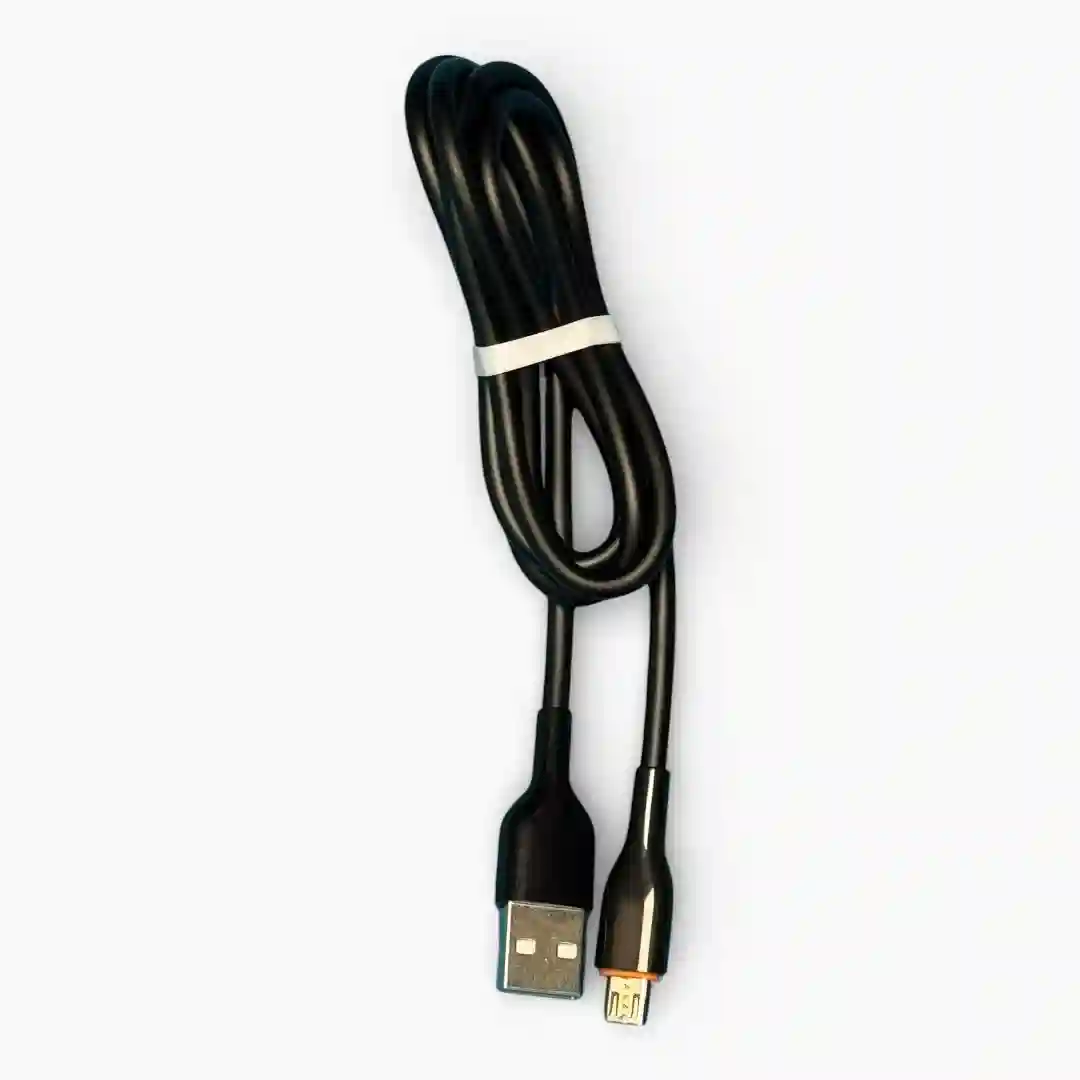 Cable de datos y carga de alta resistencia con conector Micro USB (V8), diseñado para ofrecer una transferencia de energía eficiente y una sincronización de datos estable. Su cuerpo cuenta con un revestimiento de malla trenzada en color negro que maximiza la durabilidad, protegiendo los núcleos internos contra tirones, enredos y el desgaste por uso cotidiano.