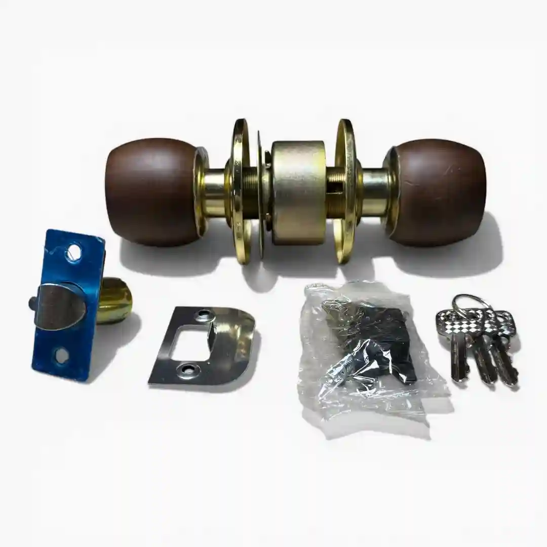 Cerradura tipo pomo diseñada con una estética clásica y elegante, fabricada con materiales de gran calidad, durabilidad y resistencia. Su acabado en madera oscura proporciona un estilo sofisticado que se integra perfectamente a la decoración de interiores, brindando seguridad y firmeza a sus puertas y espacios.