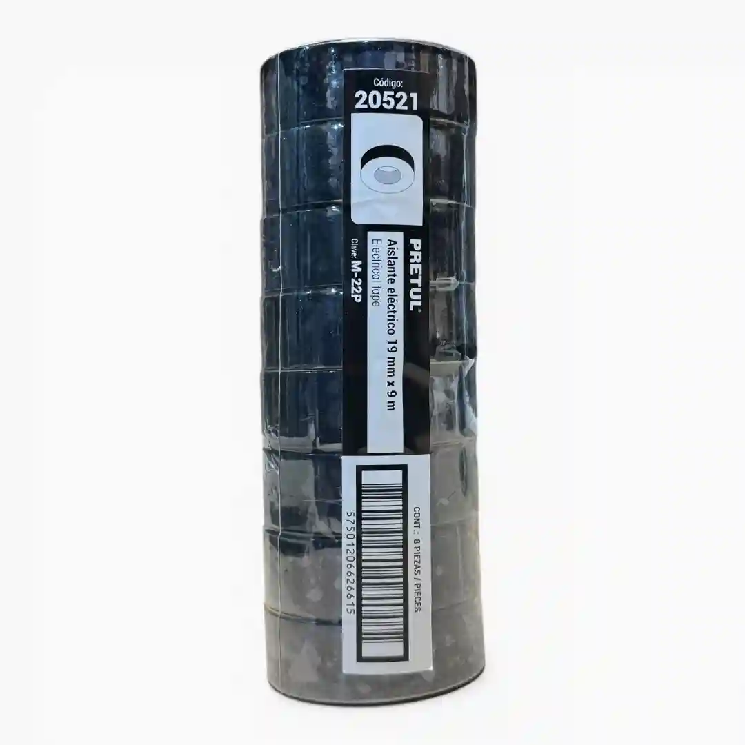 Paquete de cinta aislante eléctrica de alta calidad marca Pretul, diseñada para trabajos de mantenimiento, reparación e instalaciones eléctricas. Su presentación en torre de múltiples unidades asegura disponibilidad para proyectos extensos o uso profesional constante, garantizando un aislamiento seguro y duradero en cables y conexiones.