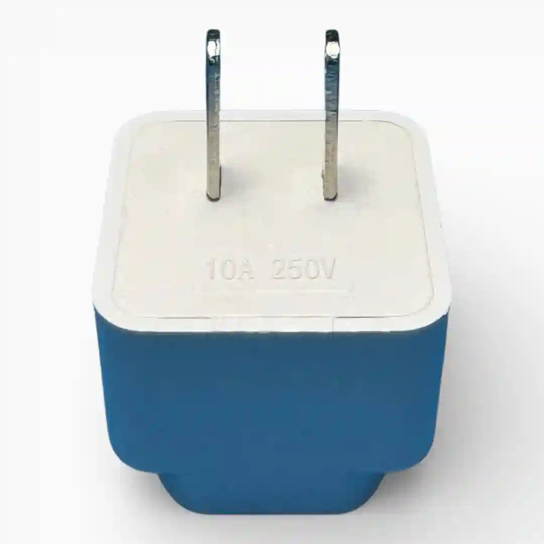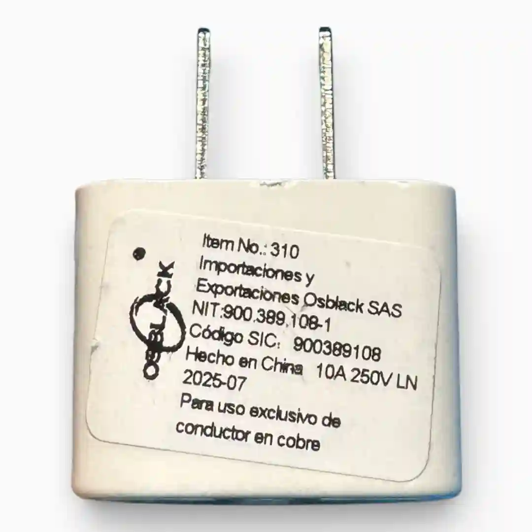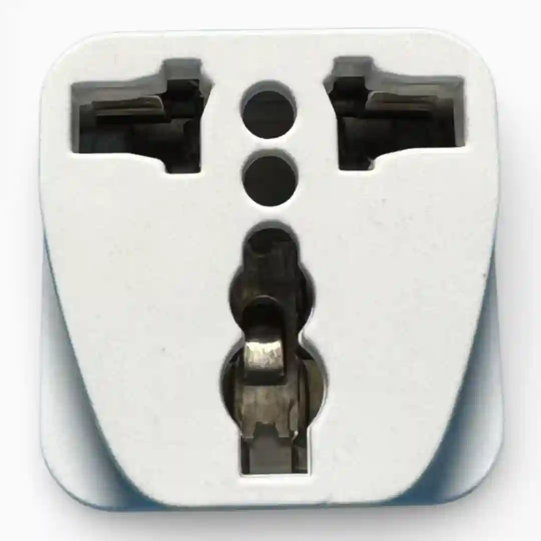 Adaptador de corriente universal diseñado para la conversión de diversos tipos de clavijas a un sistema de dos polos planos. El dispositivo cuenta con un cuerpo robusto en color blanco y azul, facilitando la conexión de equipos internacionales en tomas de corriente locales de forma segura y eficiente.