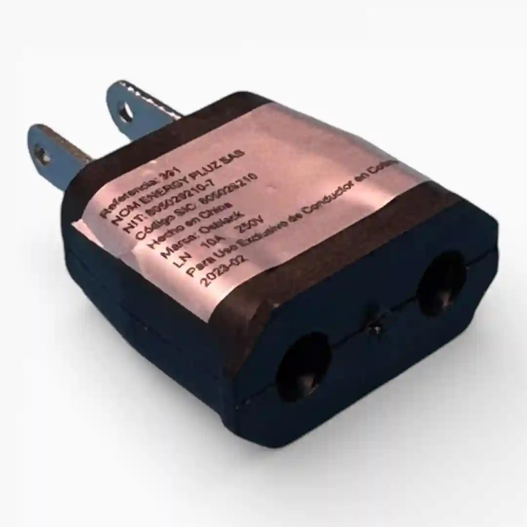 Adaptador de corriente diseñado para la conversión de terminales redondas a clavijas planas, permitiendo la conexión de dispositivos en tomas de corriente estándar. Presenta un cuerpo robusto en color negro con pines metálicos resistentes.