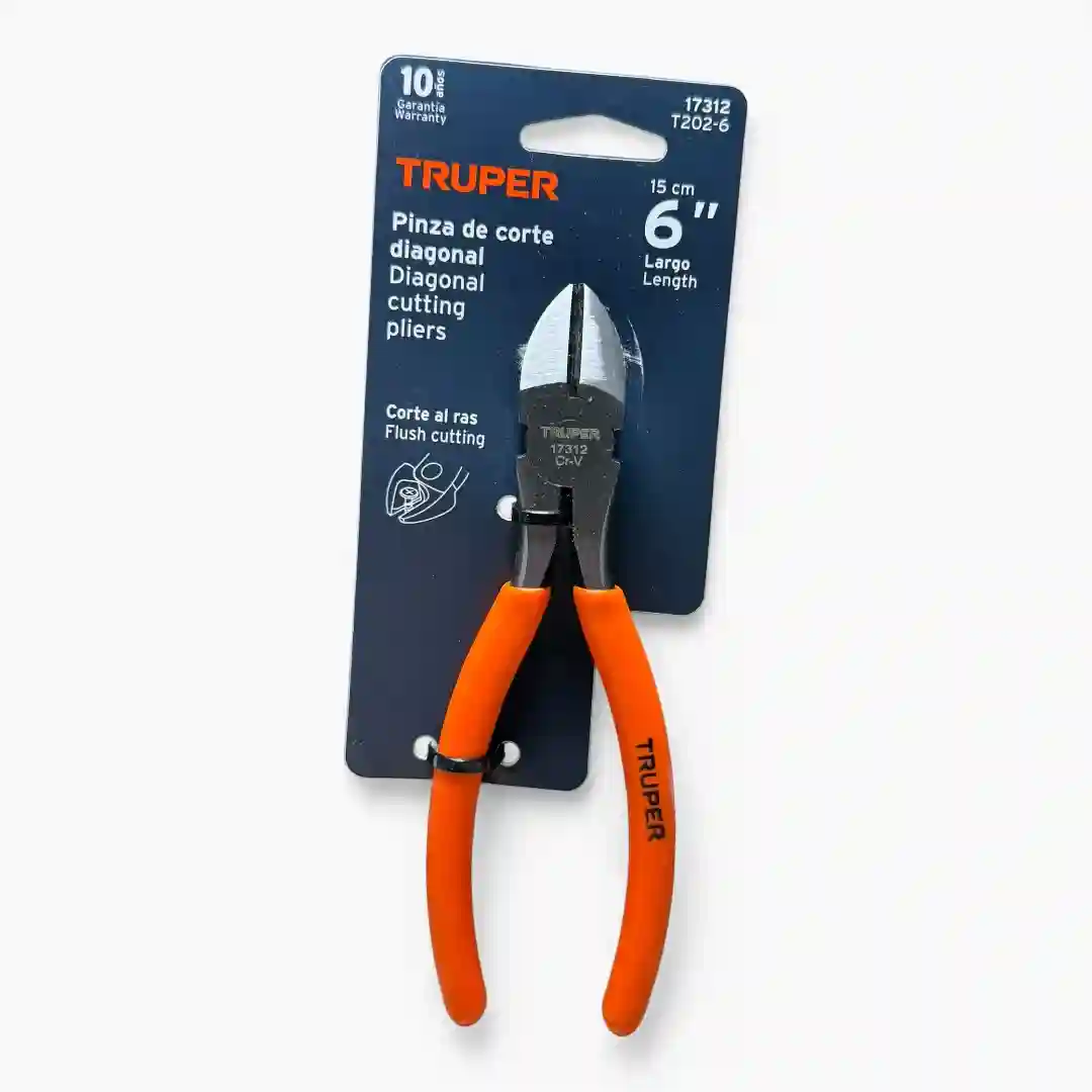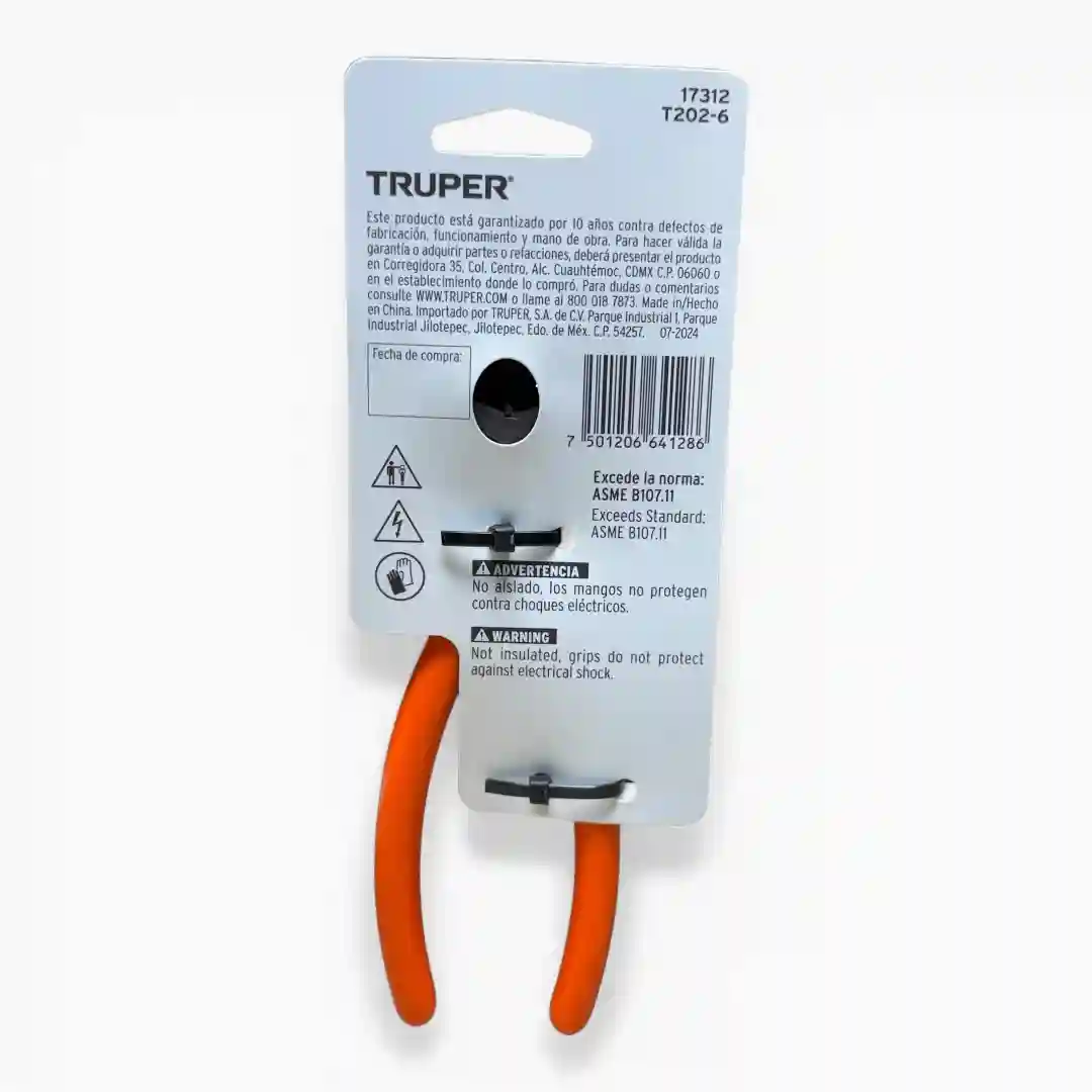 Presentación Empaque en tarjeta de cartón con soporte plástico y amarres de seguridad. El cabezal de la herramienta cuenta con el grabado de la marca TRUPER y la referencia técnica. Los mangos están revestidos en color naranja característico de la marca para facilitar su identificación.