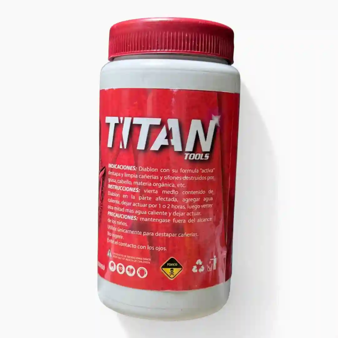 Limpiador de tuberías de alto poder bajo la línea Titan Tools. Este producto, también identificado como Diablon, cuenta con una fórmula activa diseñada para destapar y limpiar cañerías y sifones obstruidos por grasa, cabello, materia orgánica y otros residuos comunes. Es un producto de calidad garantizada para el mantenimiento preventivo y correctivo de sistemas de desagüe.