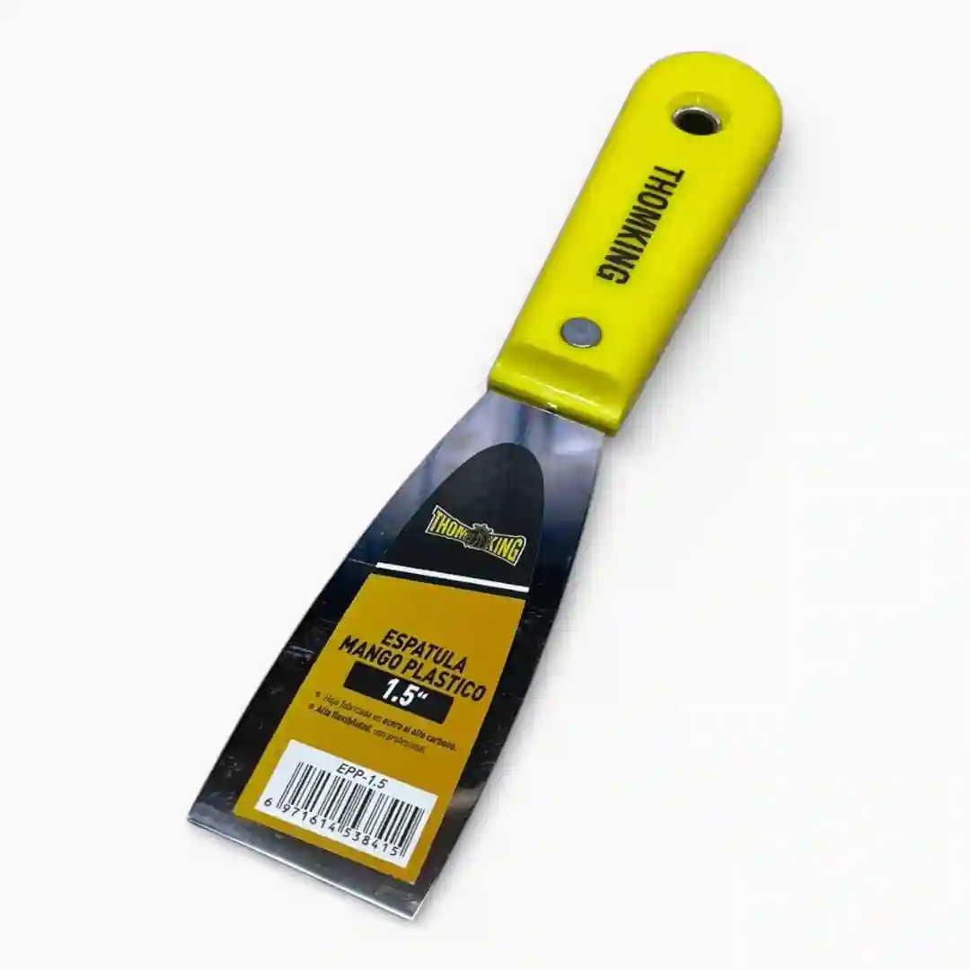 Espátula profesional de alta calidad diseñada para trabajos de precisión en construcción y remodelación. Cuenta con una hoja fabricada en acero al alto carbono que garantiza una durabilidad superior y una flexibilidad ideal para uso profesional. Su mango de plástico ergonómico en color amarillo facilita un agarre firme y cómodo, optimizando el control durante la aplicación de masillas o la remoción de residuos.