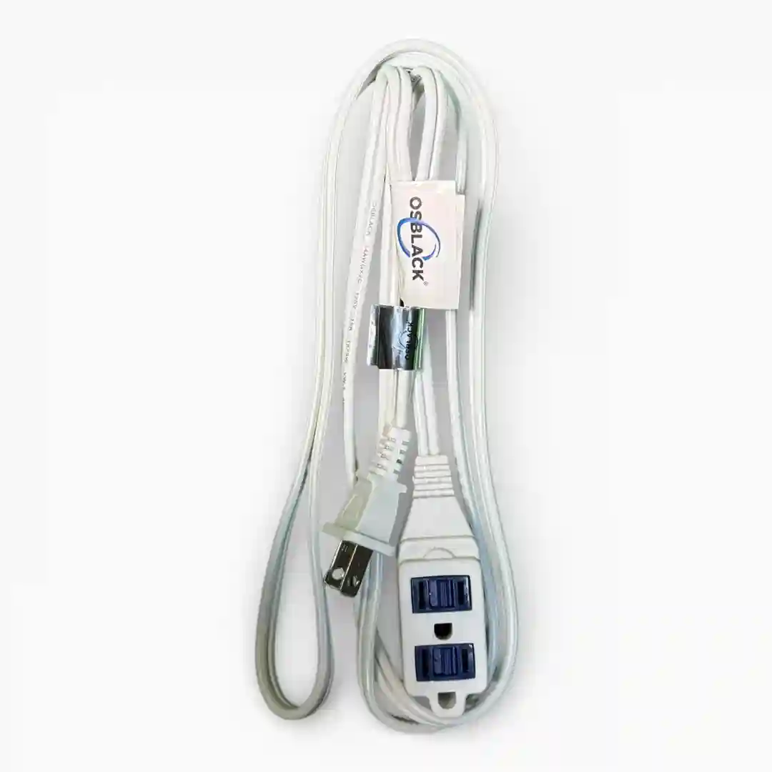 Cable de extensión eléctrica de uso doméstico y profesional de la marca OSBLACK, diseñado para ofrecer una conexión segura y confiable en espacios interiores. Su diseño flexible en color blanco se integra discretamente a cualquier ambiente, facilitando el alcance a tomas de corriente distantes.