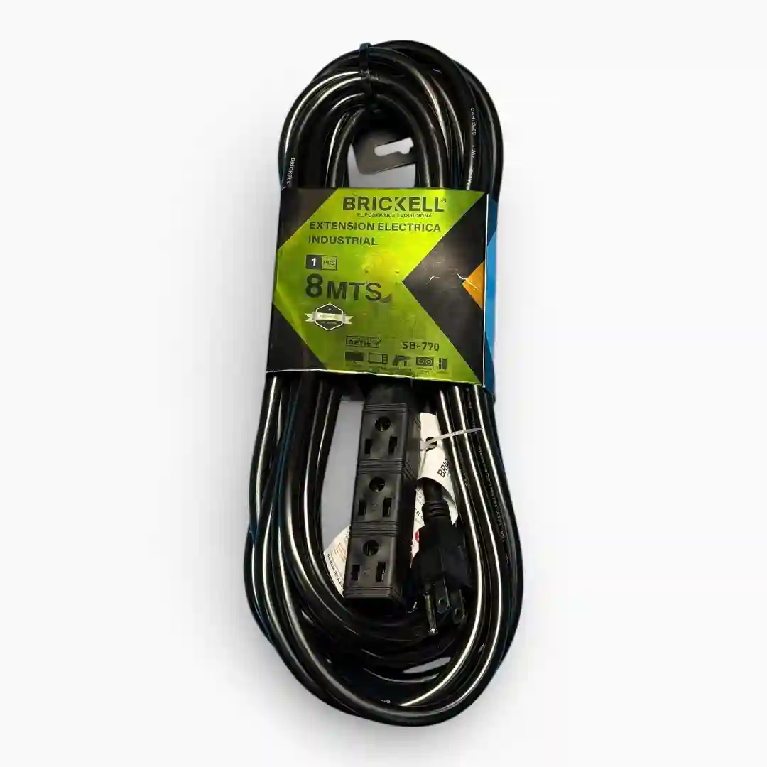 Extensión eléctrica industrial de alta resistencia diseñada para el suministro de energía en entornos de trabajo exigentes. Este producto de la marca BRICKELL combina durabilidad y seguridad, facilitando la conexión de herramientas y equipos con un alcance extendido y un diseño robusto en color negro.