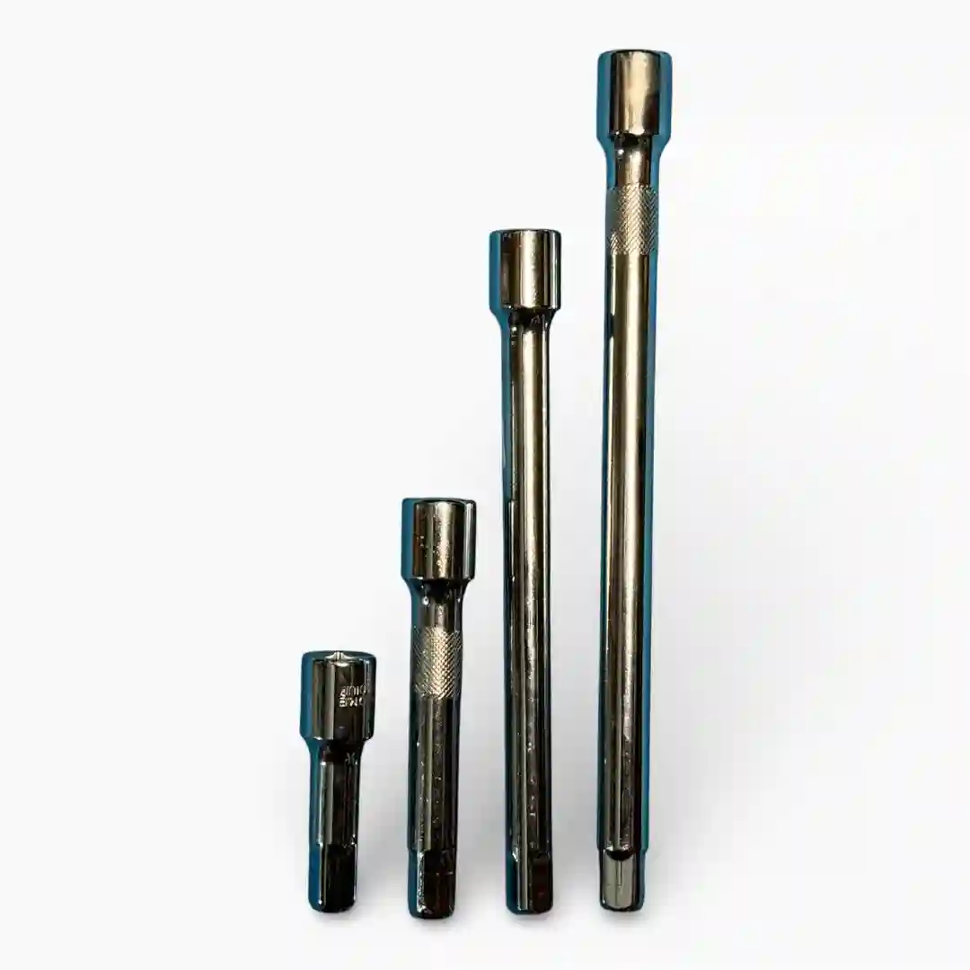 Conjunto de extensiones profesionales diseñadas para ampliar el alcance de herramientas manuales de mando de media pulgada. Fabricadas en cromo vanadio de alta resistencia con un acabado pulido espejo, estas piezas permiten acceder a pernos y tuercas en espacios profundos o de difícil acceso con total seguridad. Cada extensor cuenta con un moleteado o texturizado en el cuerpo para facilitar el agarre y giro manual, además de un sistema de retención por balín para un acople firme a los dados.