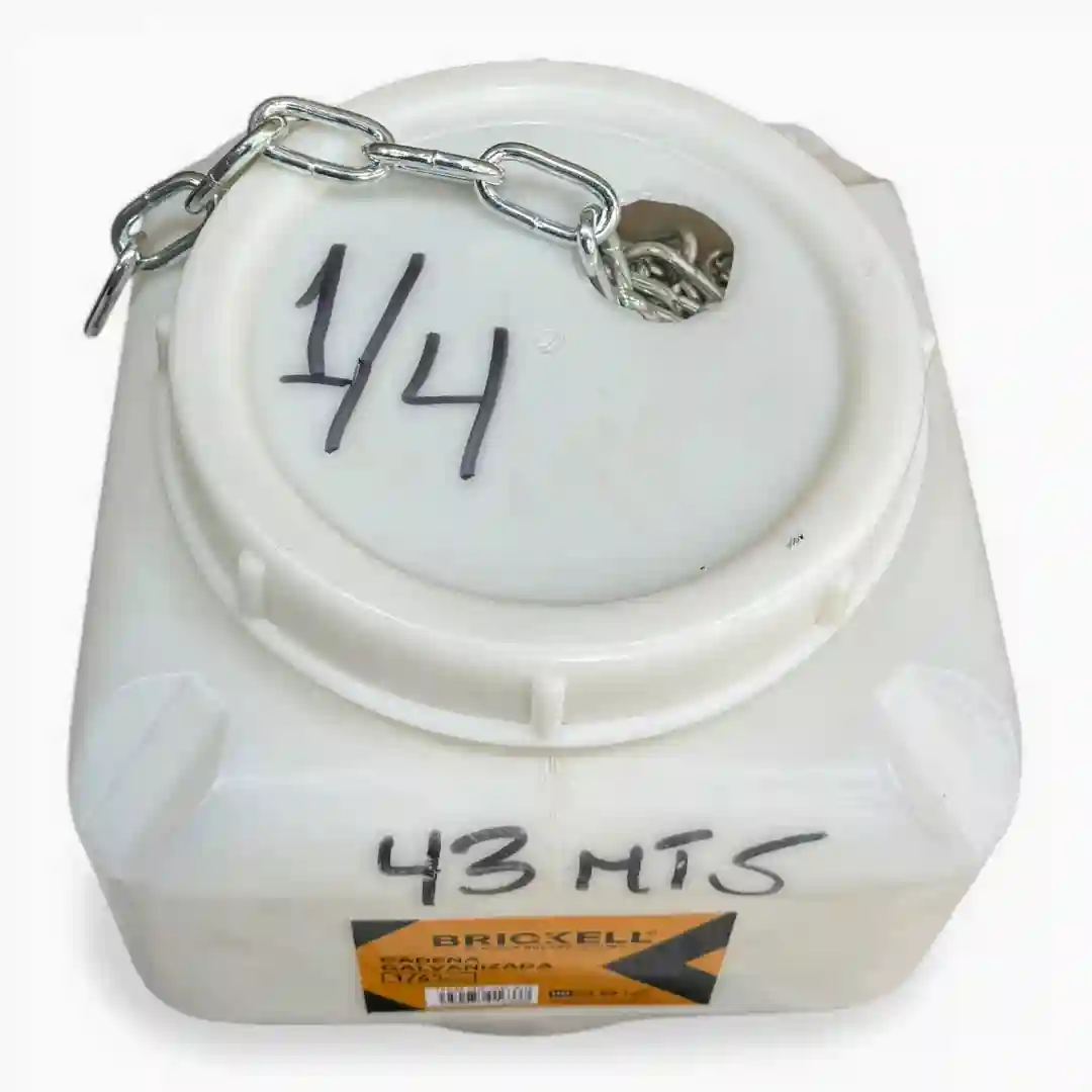 Cadena de acero con acabado galvanizado diseñada para ofrecer una alta resistencia a la corrosión y durabilidad en condiciones ambientales diversas. Su estructura de eslabones soldados proporciona la seguridad necesaria para aplicaciones de carga, sujeción y delimitación. Se presenta en un contenedor plástico funcional que permite un desenrollado organizado a través de un orificio en la tapa, facilitando su manejo y almacenamiento en entornos industriales o de construcción.