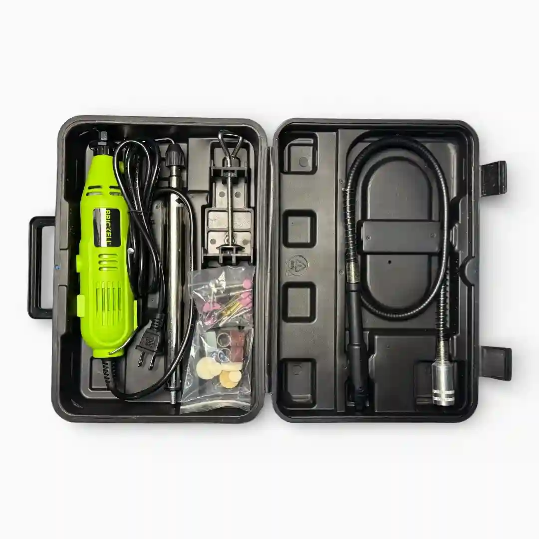 El motortool Brickell representa el poder que evoluciona, diseñado para ofrecer versatilidad y precisión en trabajos detallados. Esta herramienta rotativa, conocida también como mini amoladora, es ideal para labores de artesanía, reparaciones y acabados que requieren un control minucioso. Su diseño compacto incluye funciones esenciales como el cambio de velocidad variable y bloqueo del eje principal para facilitar el intercambio de accesorios, garantizando un desempeño eficiente en aplicaciones de industria ligera.
