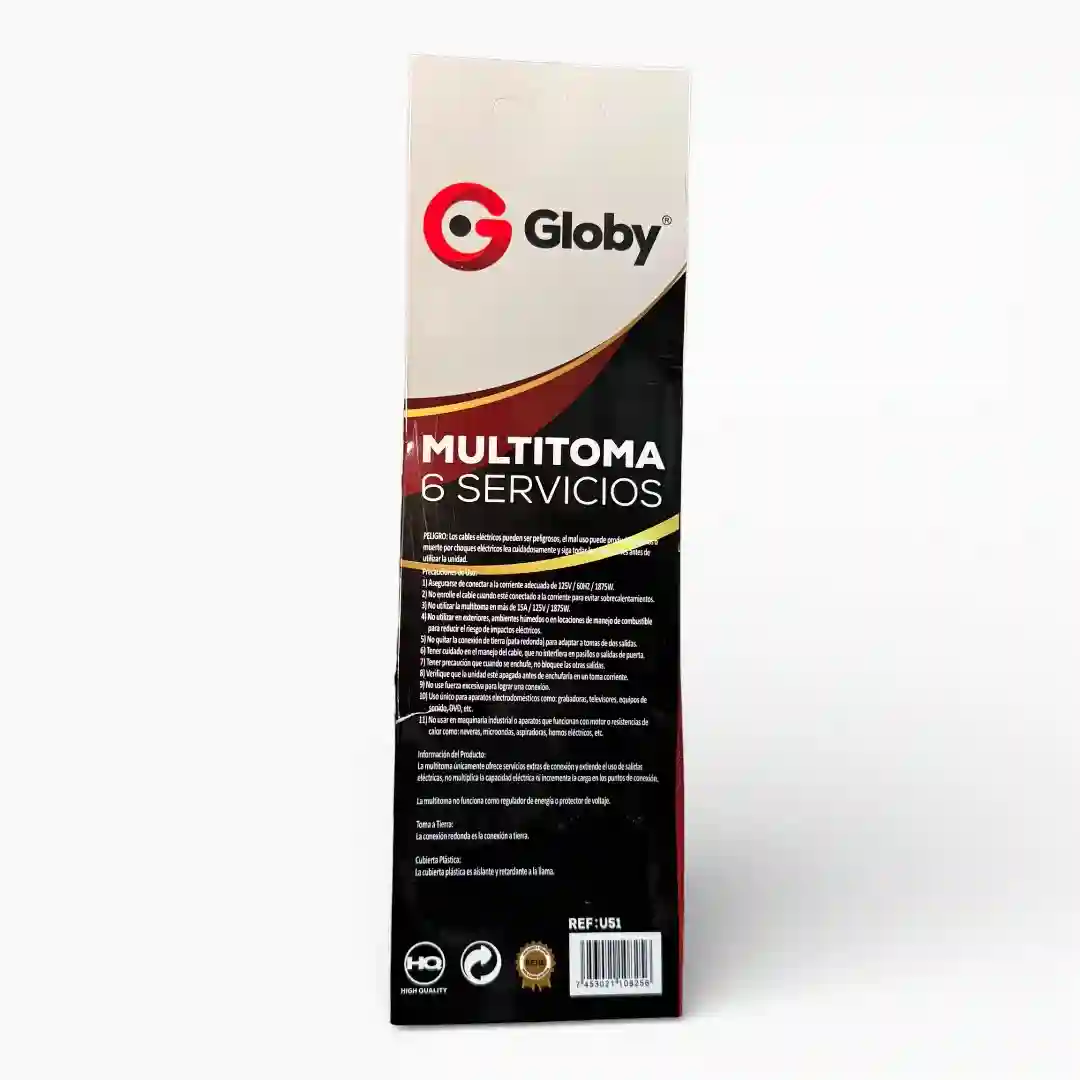 La multitoma Globy de 6 servicios es una solución eficiente para expandir sus puntos de conexión eléctrica en el hogar o la oficina. Diseñada con una cubierta plástica aislante y retardante a la llama, ofrece seguridad y practicidad. Cuenta con un interruptor de encendido y apagado (ON/OFF) con luz indicadora para un control rápido del flujo de energía.