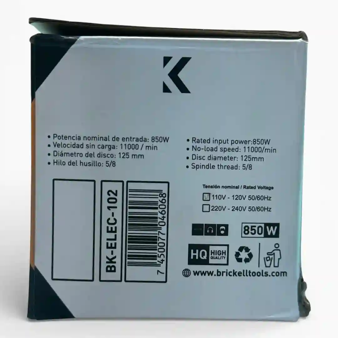 • Referencia: BK-ELEC-102 • Potencia nominal de entrada: 850W • Velocidad sin carga: 11000 / min • Diámetro del disco: 125 mm • Hilo del husillo: 5/8 • Tensión nominal: 110V – 120V • Frecuencia: 50/60Hz • Garantía: 1 año