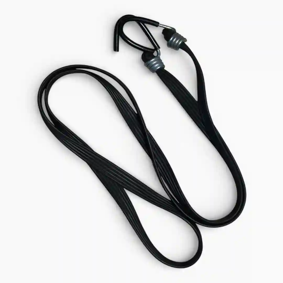 Características Cuerda elástica plana de color negro Ganchos metálicos reforzados en los extremos Recubrimiento protector en las puntas de los ganchos para evitar rayaduras Diseño de banda múltiple para una distribución uniforme de la presión
