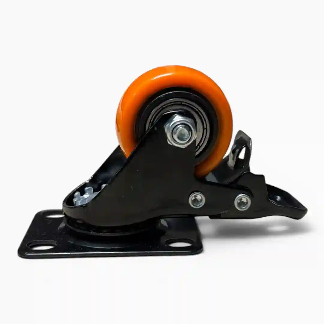 Rodachina industrial de alta resistencia diseñada para ofrecer movilidad suave y segura en diversos tipos de mobiliario o equipos de carga ligera. Este componente destaca por su rueda en poliuretano de color naranja vibrante, la cual protege las superficies de rayaduras y ruidos molestos. Su estructura metálica robusta en color negro garantiza durabilidad y estabilidad en cada desplazamiento.