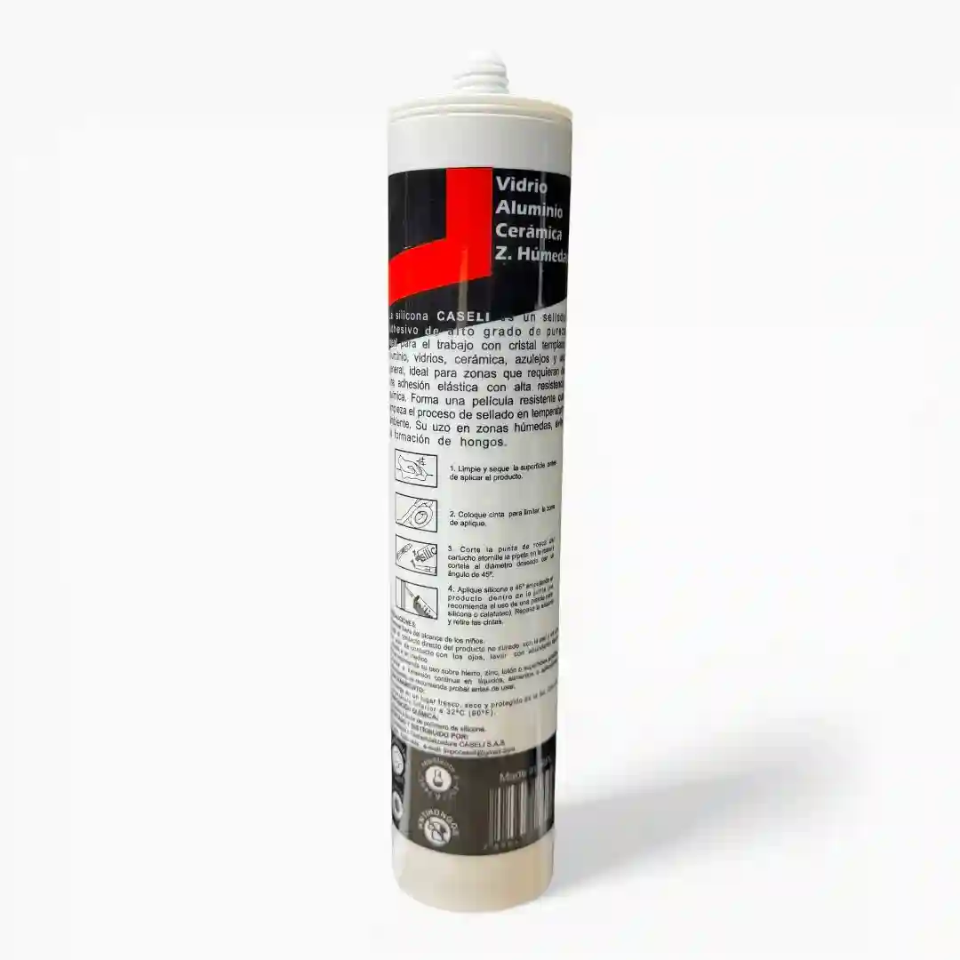 La silicona CASELI es un sellador adhesivo de alto grado de pureza, formulado especialmente para el trabajo con cristal templado, aluminio, vidrios, cerámica y azulejos. Es una solución ideal para zonas que requieran una adhesión elástica con alta resistencia química. El producto forma una película resistente que inicia su proceso de sellado a temperatura ambiente, siendo altamente efectivo en zonas húmedas al evitar la formación de hongos.