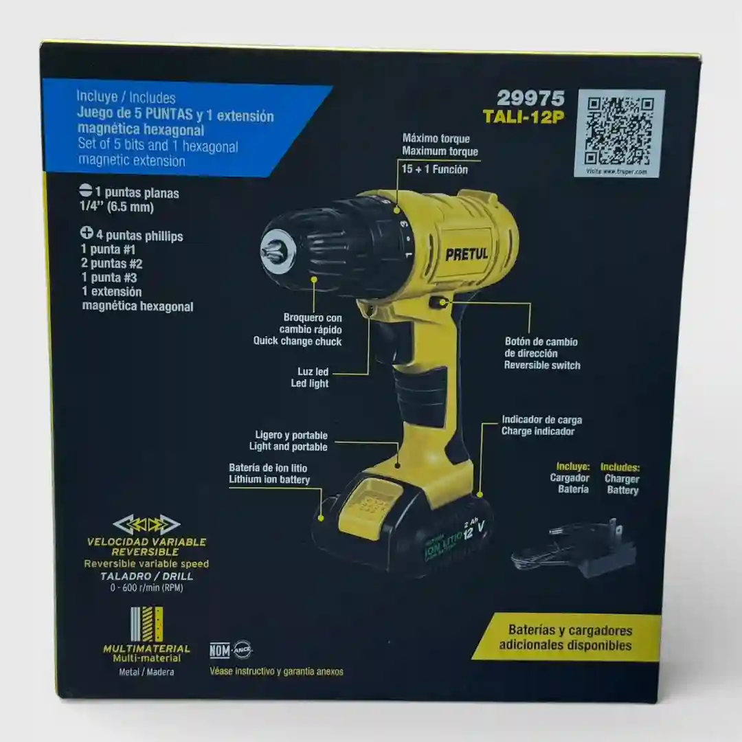 El taladro inalámbrico Pretul es una herramienta compacta y eficiente diseñada para perforación y atornillado en diversos materiales. Su tecnología de iones de litio proporciona una fuente de energía constante y duradera, facilitando el trabajo en lugares sin acceso a tomas de corriente. El equipo cuenta con un diseño ergonómico que incluye una luz LED para iluminar el área de trabajo y un control de torque ajustable para garantizar resultados precisos en cada aplicación.