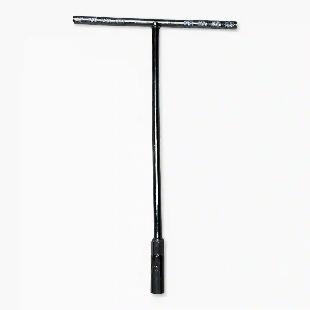 Herramienta manual tipo llave en T fabricada en metal de alta resistencia con acabado cromado. Su diseño ergonómico permite aplicar torque de manera equilibrada y cómoda, facilitando el acceso a espacios reducidos o profundos gracias a su eje extendido. Es un elemento esencial para trabajos mecánicos que requieren precisión y firmeza.