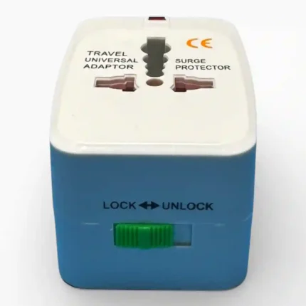 Características Adaptador universal de viaje Todo en uno Protector de sobretensión Sistema de bloqueo y desbloqueo manual Obturador de seguridad para protección infantil Luz indicadora de encendido Incluye bolsa de transporte textil color azul Color del producto: Blanco y azul Material: Para uso exclusivo de conductor en cobre