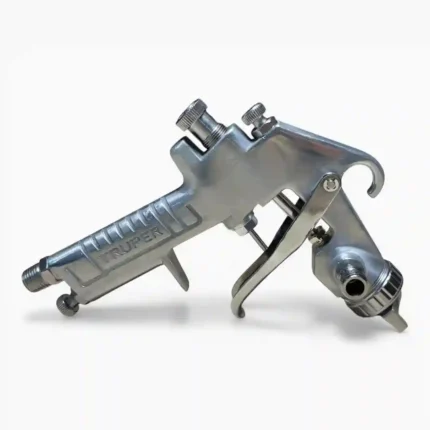 Pistola de gravedad para pintar de Bajo Volumen y Mediana Presión (LVMP), diseñada para la aplicación profesional de materiales de media y alta viscosidad. Este equipo es compatible con productos base agua y base solvente, ofreciendo una pulverización fina y un acabado libre de goteo gracias a su boquilla de alta precisión. Su diseño incluye un vaso de aluminio multiposición que facilita el trabajo en diferentes ángulos.