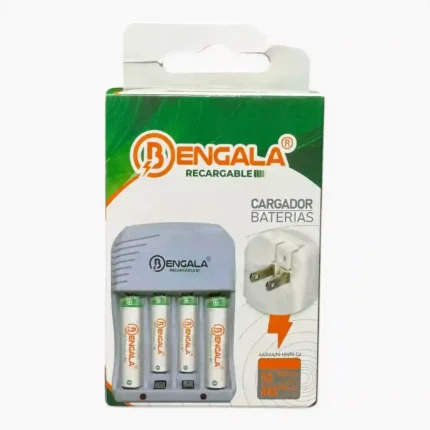 Cargador de baterías recargables de alta eficiencia marca Bengala, diseñado para suministrar energía de manera segura y práctica a dispositivos electrónicos de uso cotidiano. Este modelo cuenta con un diseño compacto que incluye un enchufe de pared plegable para facilitar su almacenamiento y transporte. Incluye un juego de pilas recargables para un uso inmediato y una entrada de puerto USB para mayor versatilidad de conexión. Características Carga de 1 a 4 pilas AA o AAA recargables. Luz LED encendida para indicar el proceso de carga. Entrada de puerto USB. Enchufe integrado plegable. Compatible con baterías de Níquel-Metal Hidruro (Ni-MH) y Níquel-Cadmio (Ni-Cd). Especificaciones Referencia: BG-6385 Entrada: Corriente Alterna 100-240V 50/60Hz 10W Máximo Salida AA (HR-06): Corriente Directa 1.2V 1500mA Salida AAA (HR-03): Corriente Directa 1.2V 1100mA Presentación: Empaque individual con 4 pilas incluidas (2 unidades AA de 1500mAh y 2 unidades AAA de 1100mAh). Precauciones La mala manipulación puede provocar descargas eléctricas. Mantener fuera del alcance de los niños. No se debe desmontar ni montar por personas no profesionales. Úselo en temperaturas entre 0°C y 40°C. No lo use bajo el sol o la lluvia. No cargue baterías alcalinas o de carbón de 1.5V, de lo contrario se producirá una fuga o una explosión. No mezcle cargas de baterías de diferentes especificaciones o capacidades. Asegura la energía de tus dispositivos hoy mismo enviando tu pedido a través de nuestra plataforma digital.
